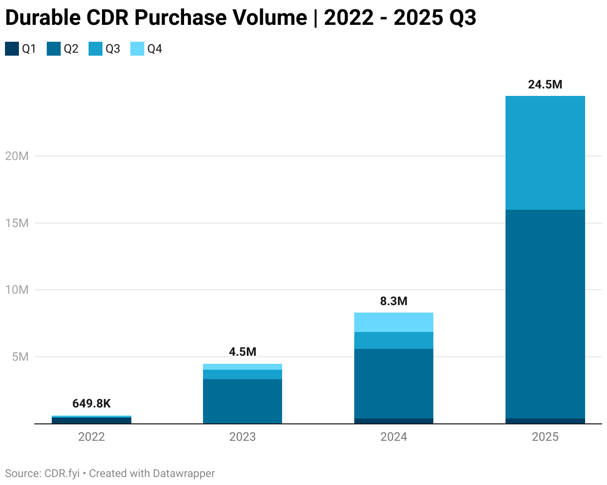 According to a new report by CDR.fyi, the durable CDR market reached 8.5 Mt contracted in Q3 2025, up 54% from Q2 and already surpassing 2024 totals. However, 93% of volume came from two Microsoft megadeals, with only 604 kt purchased by 67 other buyers. Biomass-based pathways dominated. Despite record contracts, delivery and buyer diversification remain weak signals for the sector’s strength.