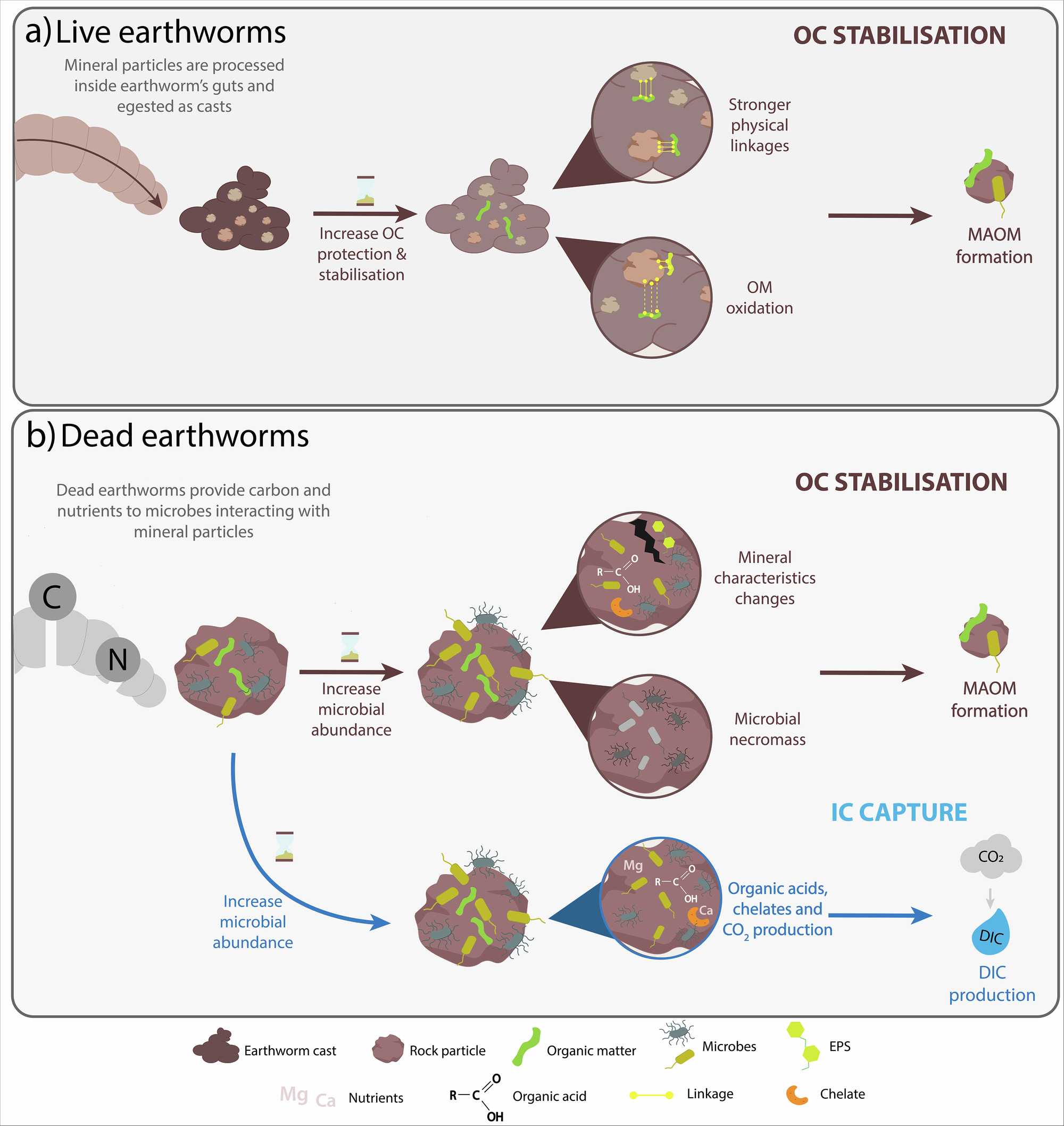 Synopsis: Enhanced rock weathering captures atmospheric CO₂ and may stabilize soil organic carbon, with earthworms playing a key role. Using stable isotope tracing, the study shows that live earthworms promote organo-mineral associations via dejections, enhancing organic carbon persistence, while dead earthworms boost microbial activity, increasing inorganic carbon capture. Earthworms thus influence carbon cycling across their life cycle through distinct biological and physico-chemical pathways.