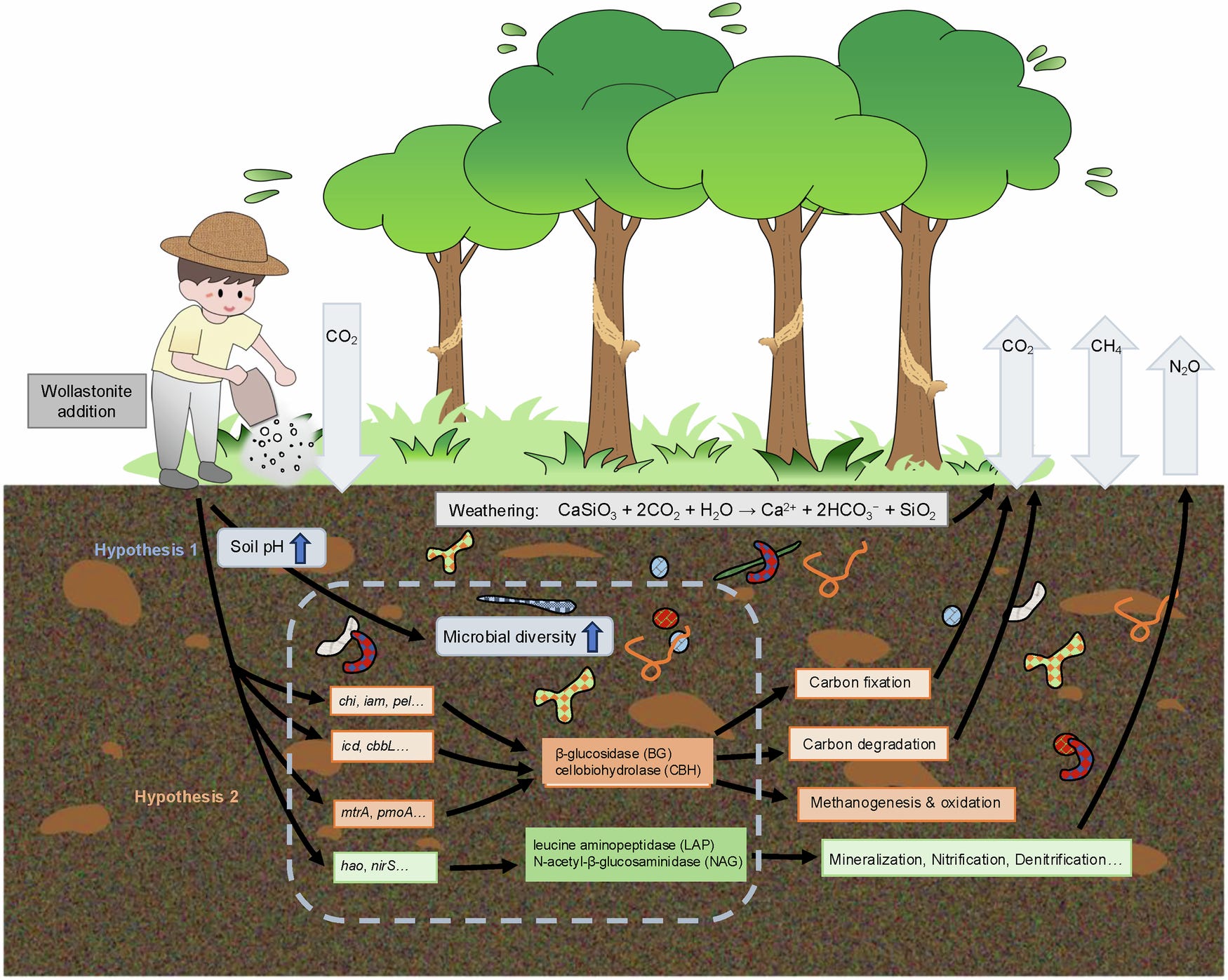 Synopsis: This study examined enhanced rock weathering with wollastonite in a tropical rubber plantation over two years, using metagenomics to assess microbial carbon and nitrogen cycling. ERW raised soil pH, boosting alpha diversity of cycling genes, increasing carbon-fixation and reducing carbon-degradation genes. Nitrogen-cycling genes and available iron also rose, suggesting ERW may affect nitrous oxide emissions and soil organic matter dynamics through biological and chemical pathways.