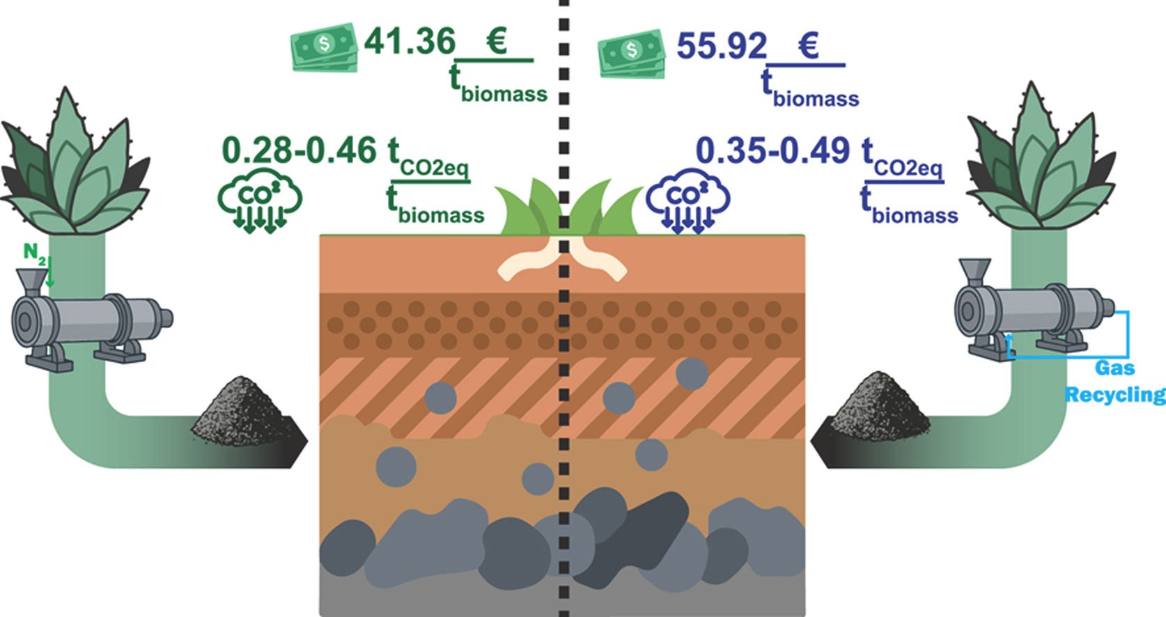 Synopsis: This study evaluates the carbon removal potential of Agave wercklei biochar under different pyrolysis conditions. Using temperatures from 350–575 °C and atmospheres of nitrogen (N₂) and recirculated pyrolysis gas (PyGR), results show that higher pyrolysis temperature greatly enhances carbon permanence, especially with PyGR. Biochars produced ≥500 °C under PyGR achieved the highest sequestration (up to 0.58 tCO₂eq t⁻¹ biomass) and greater economic returns (~65 € t⁻¹ biomass). Findings stress the need to account for soil temperature and realistic pyrolysis atmospheres in carbon certification and modeling.