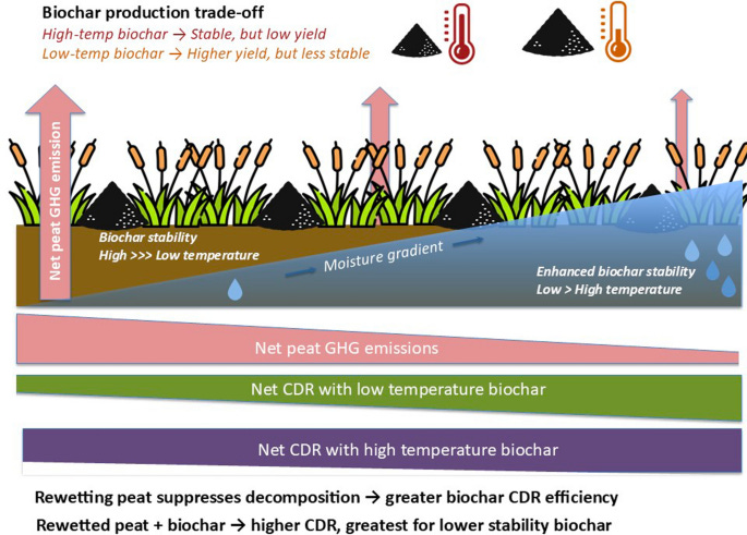 Synopsis: This perspective explores synergies between biochar application and peatland rewetting as a strategy to improve biomass-based CDR. Rewetted peatlands can suppress microbial decomposition, enhancing biochar permanence—especially for lower-stability biochars that retain higher carbon yields. Modelling suggests this combination reduces carbon losses compared to applying high-stability biochar to dry soils, potentially easing biomass constraints and improving scalability, while highlighting trade-offs such as land-use change and methane emissions.